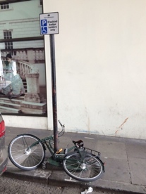 It was only when I got out of my car to unload my wheelchair that I realised I was going to have a problem, a very inconsiderate cyclist had chained his bike to the post displaying the Blue Badge signage. This meant that getting my chair out was going to be very difficult.
